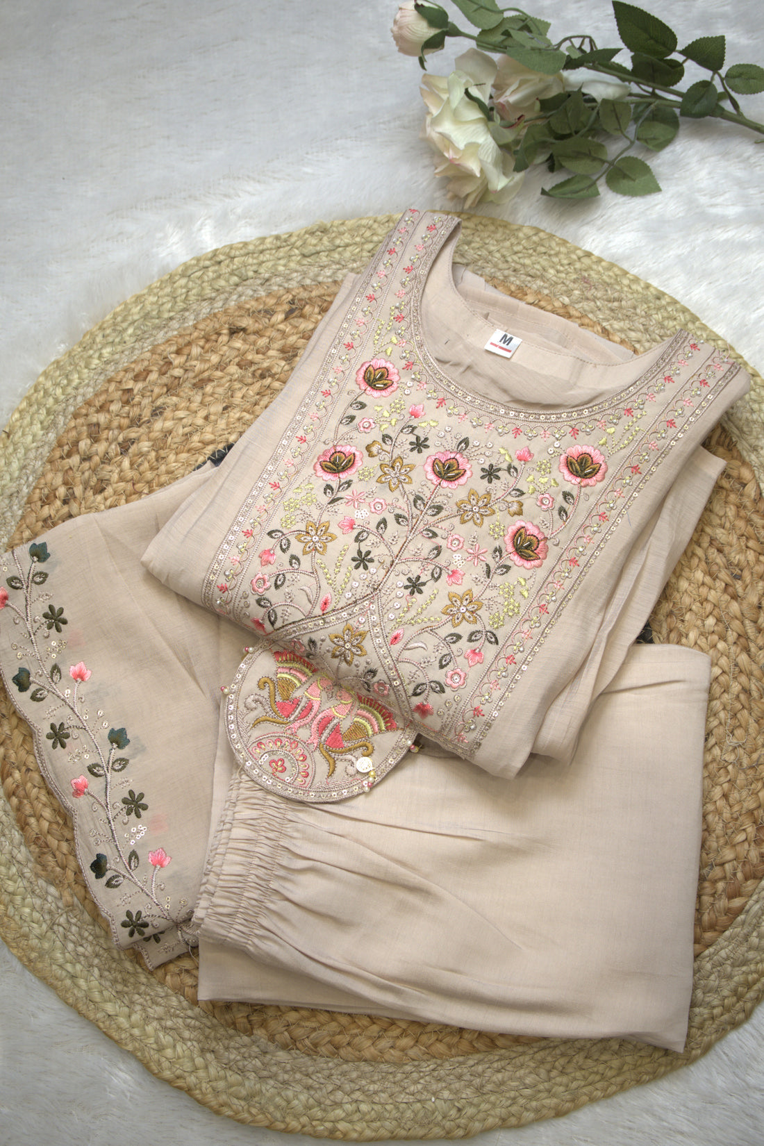 This sophisticated beige suit set offers a perfect blend of tradition and subtle luxury. Crafted...