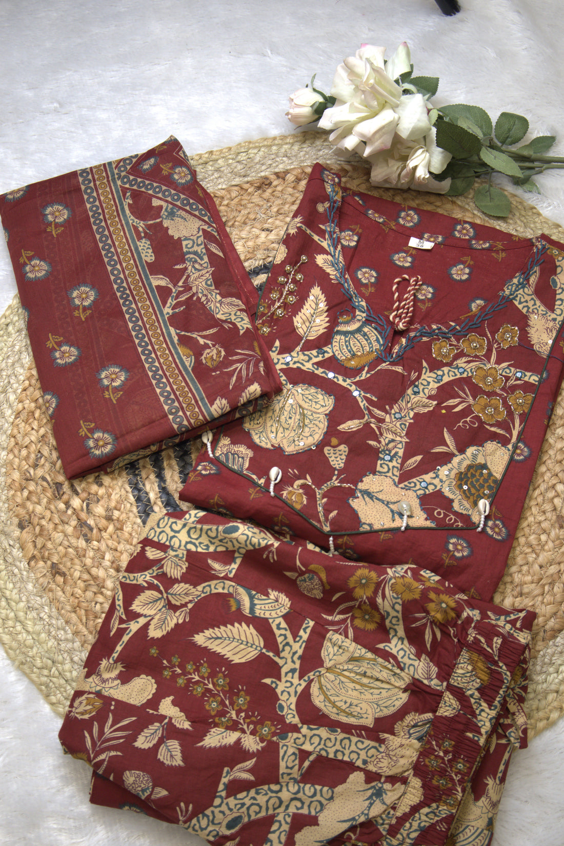 ✨ Kurta Color: Deep maroon Print: All-over small floral motifs in beige and blue Neckline:...