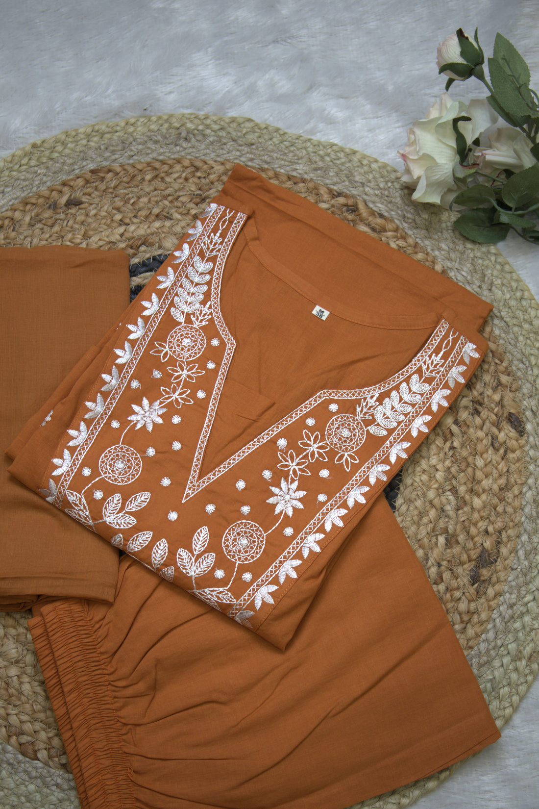 A beautifully elegant three-piece rust orange ethnic suit set featuring minimal embroidery and a modern,...