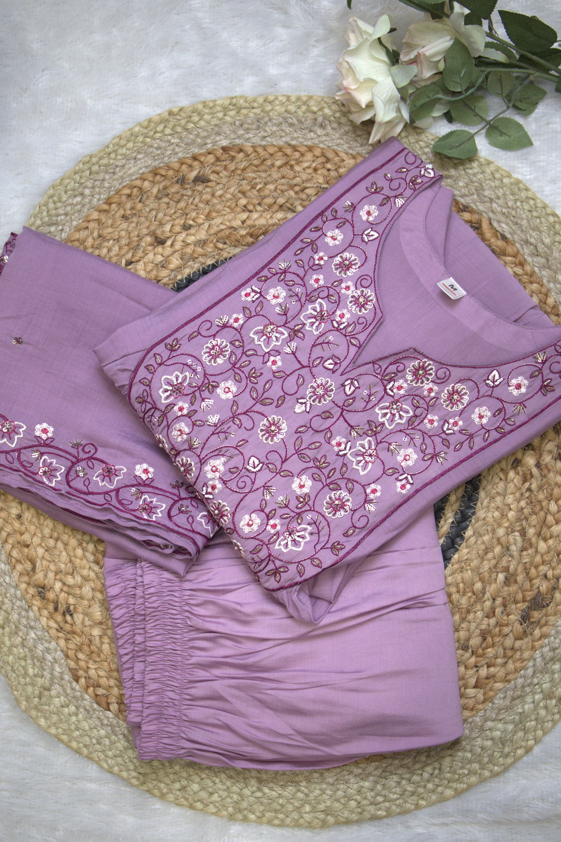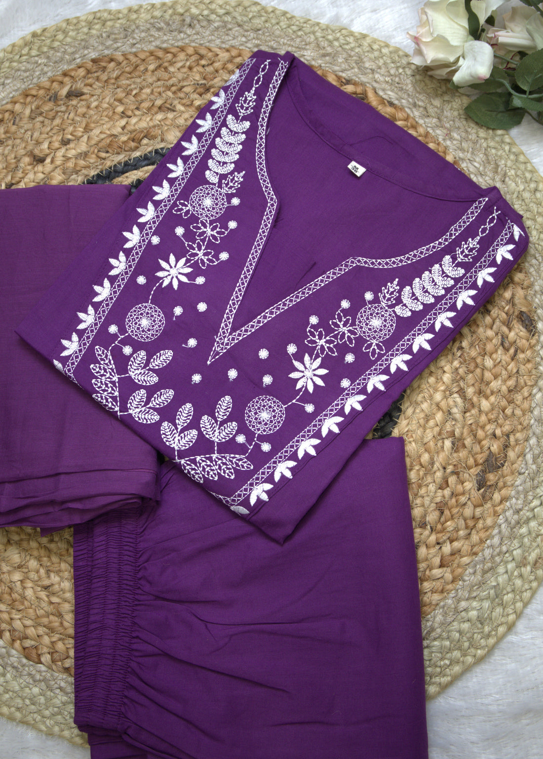 This is a graceful three-piece purple ethnic suit set featuring delicate white embroidery and a...