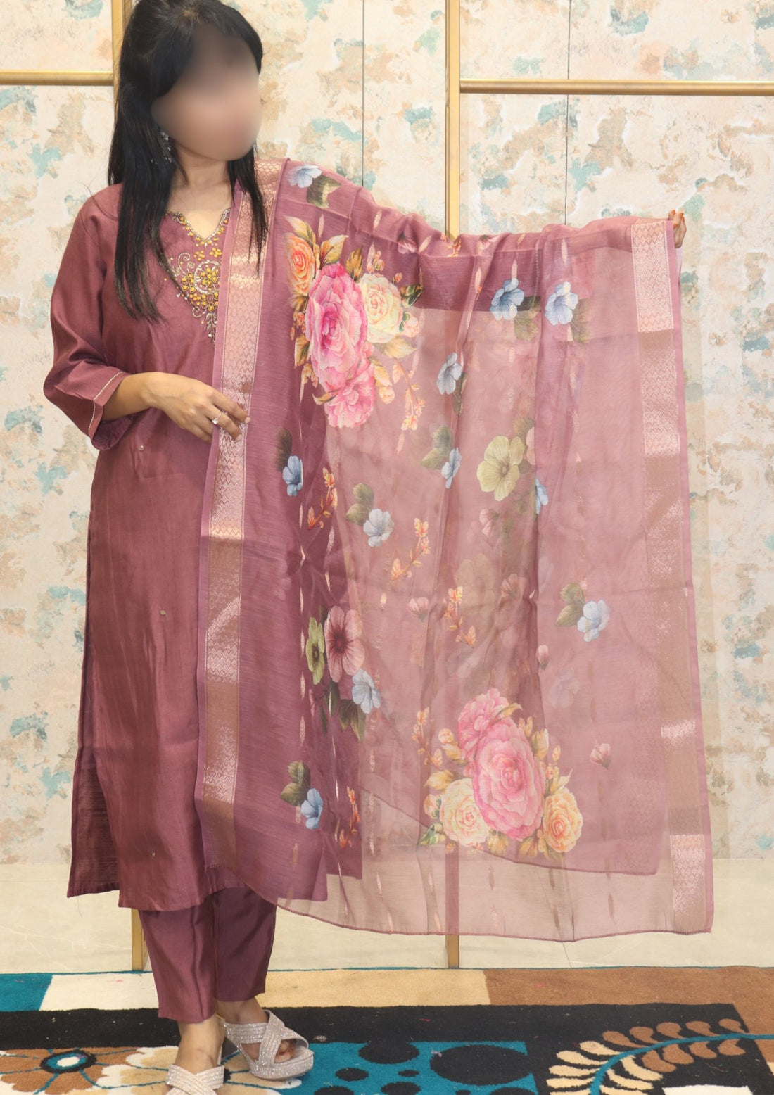 Dusty Rose Kurta Set with Floral Dupatta