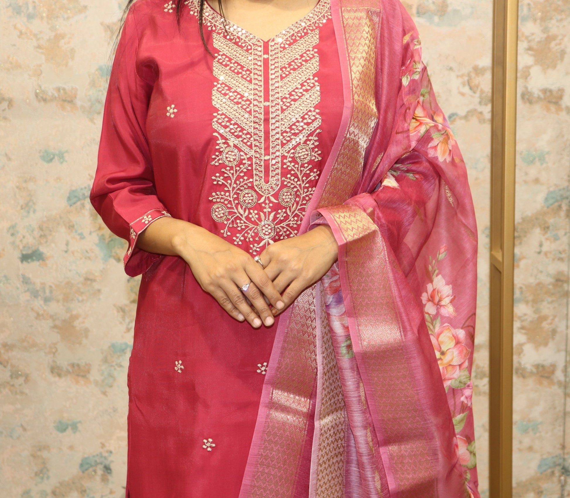 Deep Pink Semi-Formal Kurta Set with Floral Accents