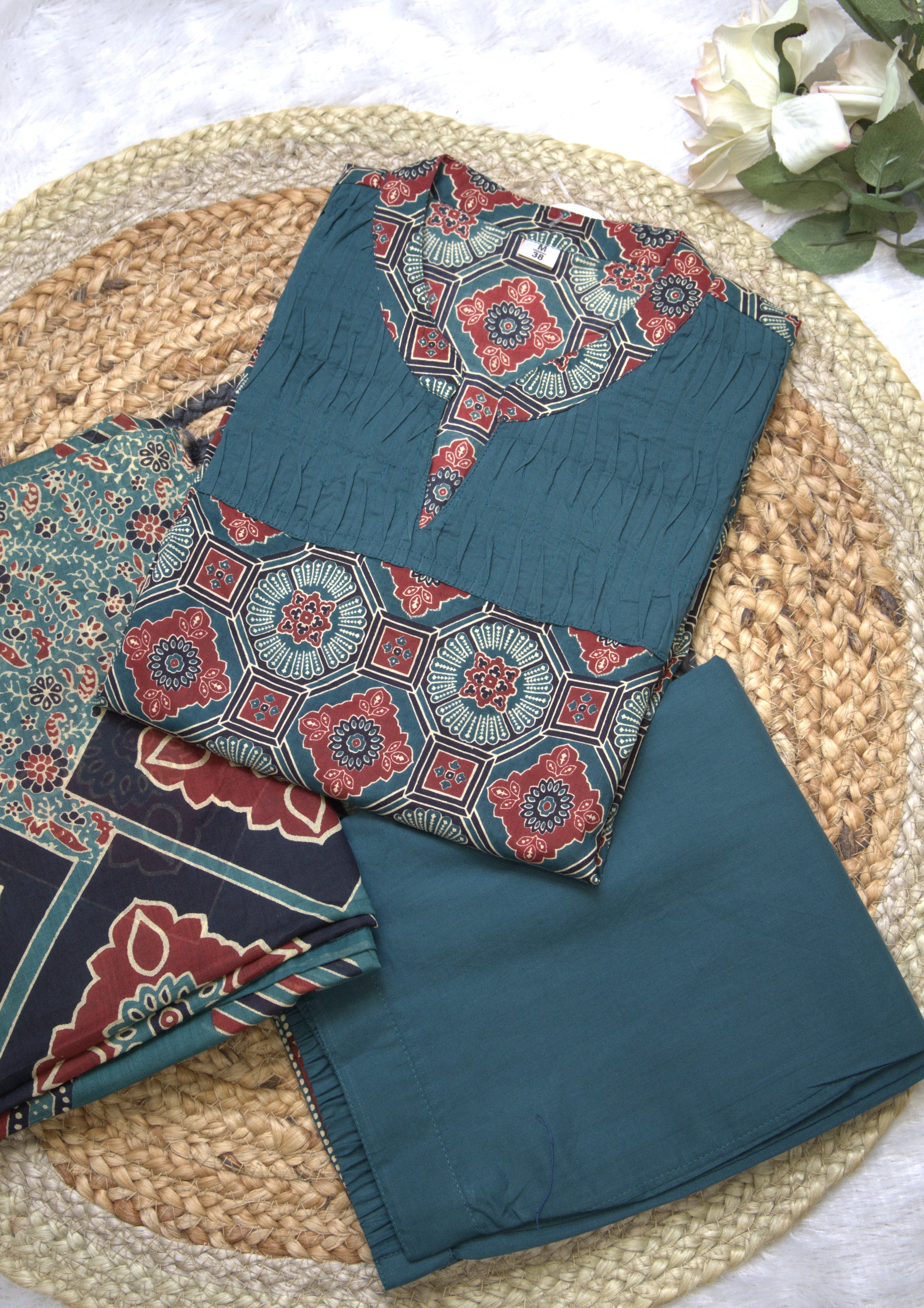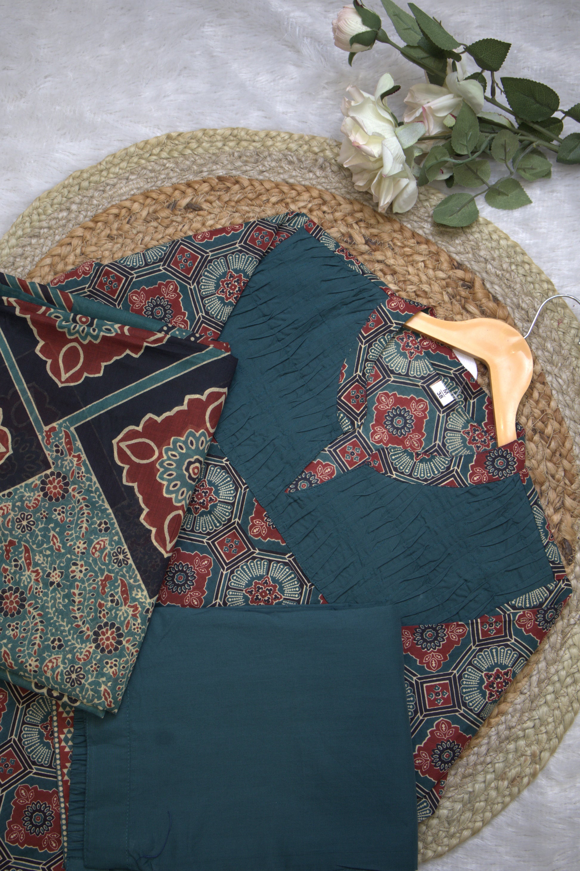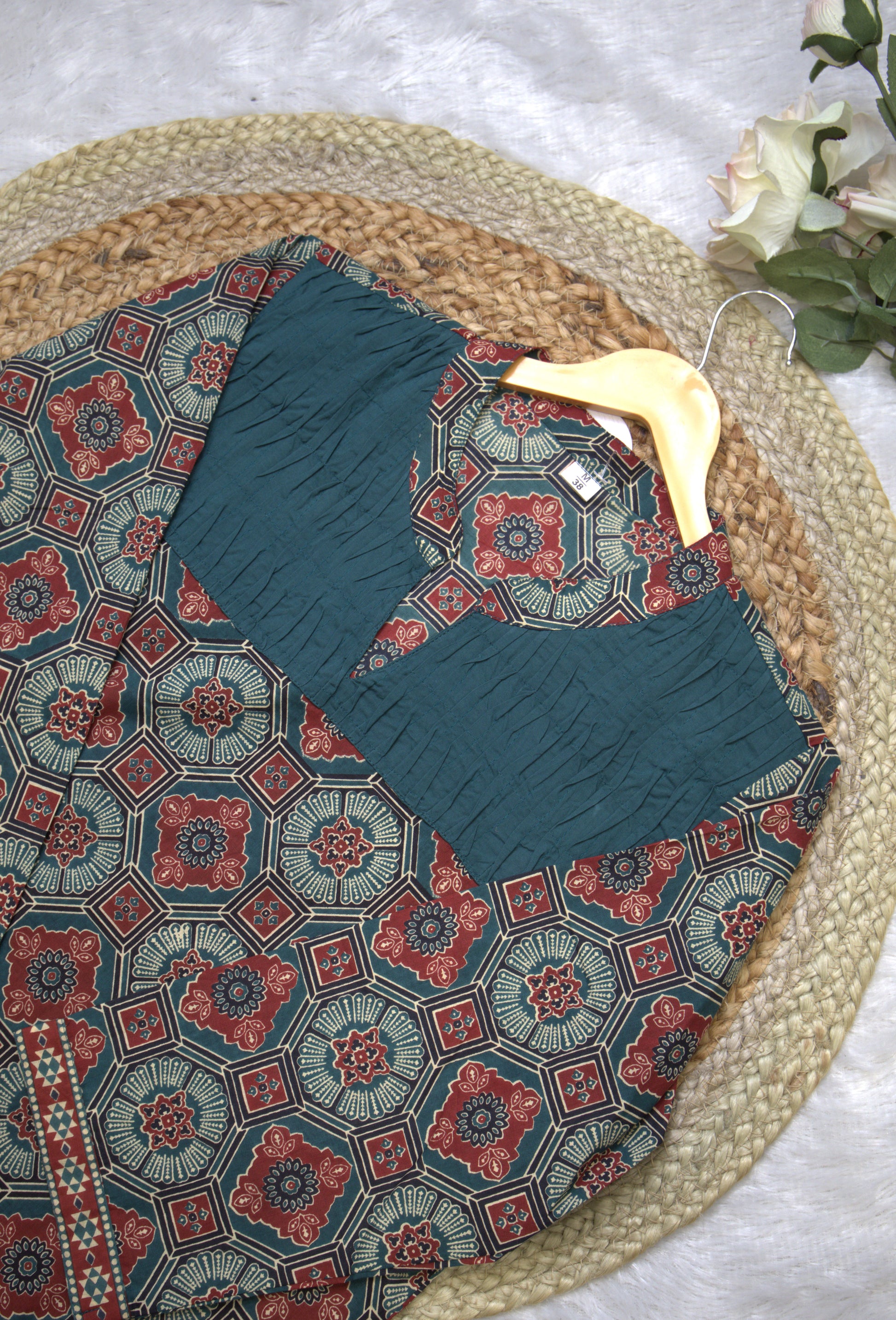 The kurta features a beautiful geometric and floral block-print mix in shades of maroon, beige, and teal.