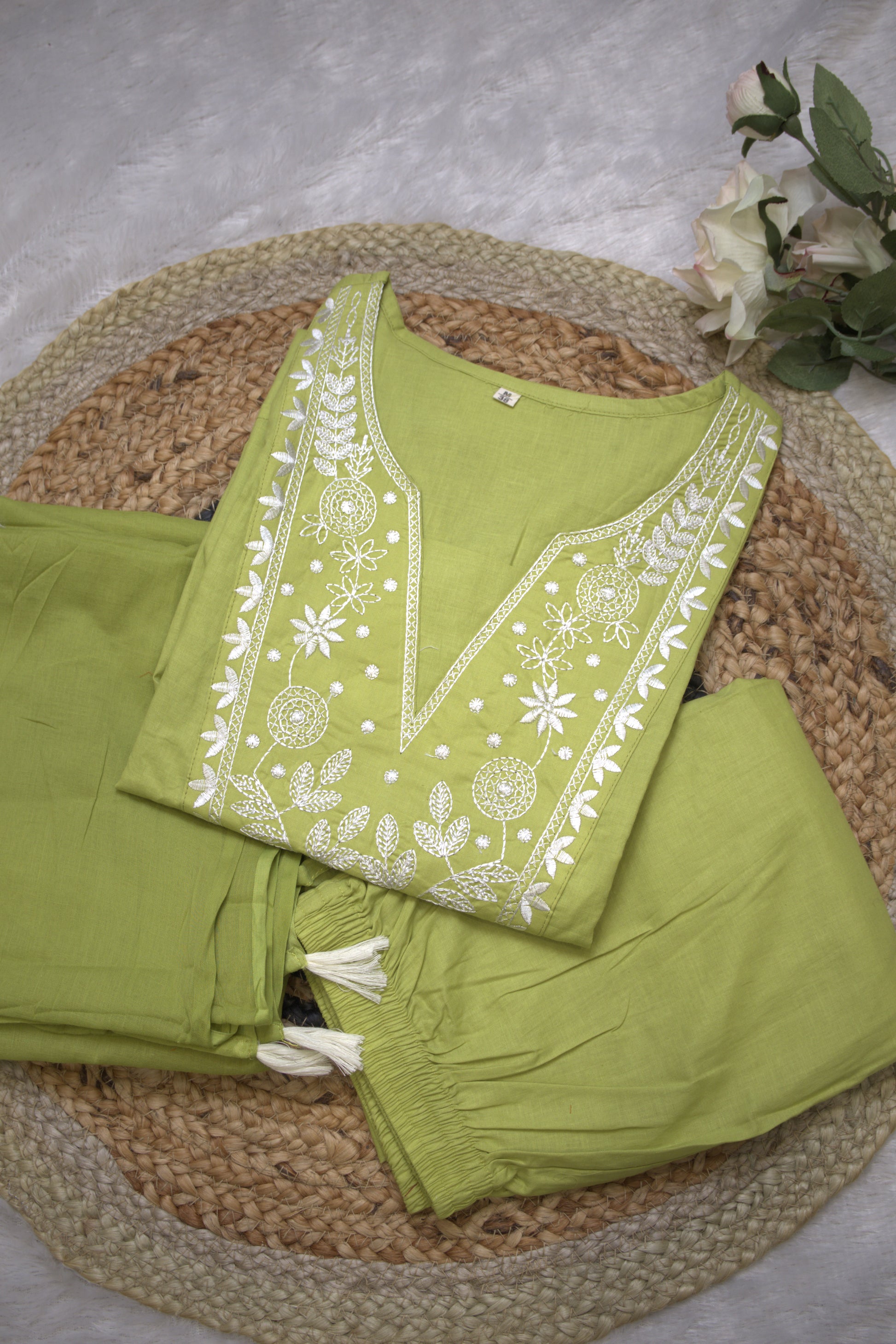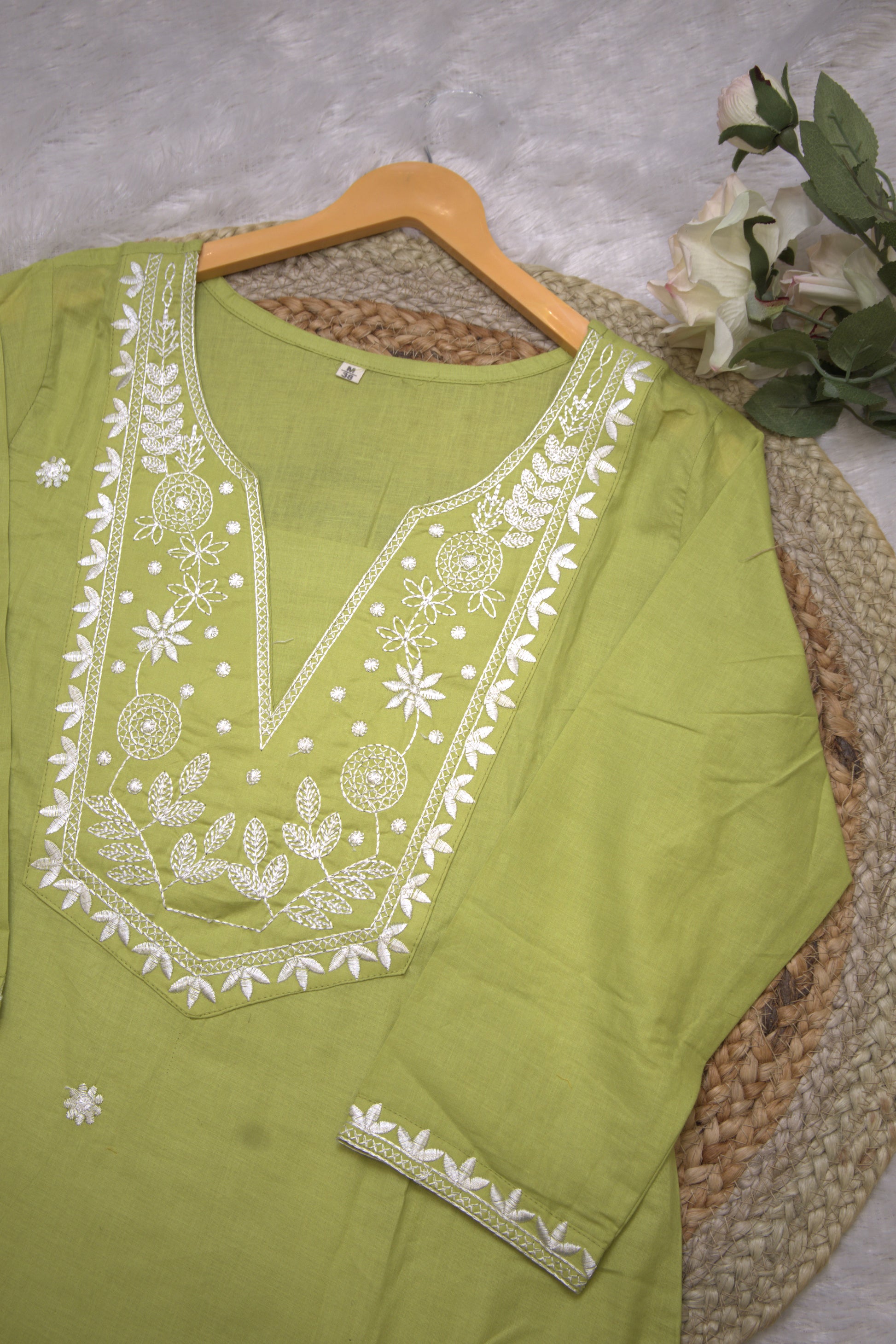 The neckline is a V-shape with an embroidered yoke showcasing floral and paisley motifs.