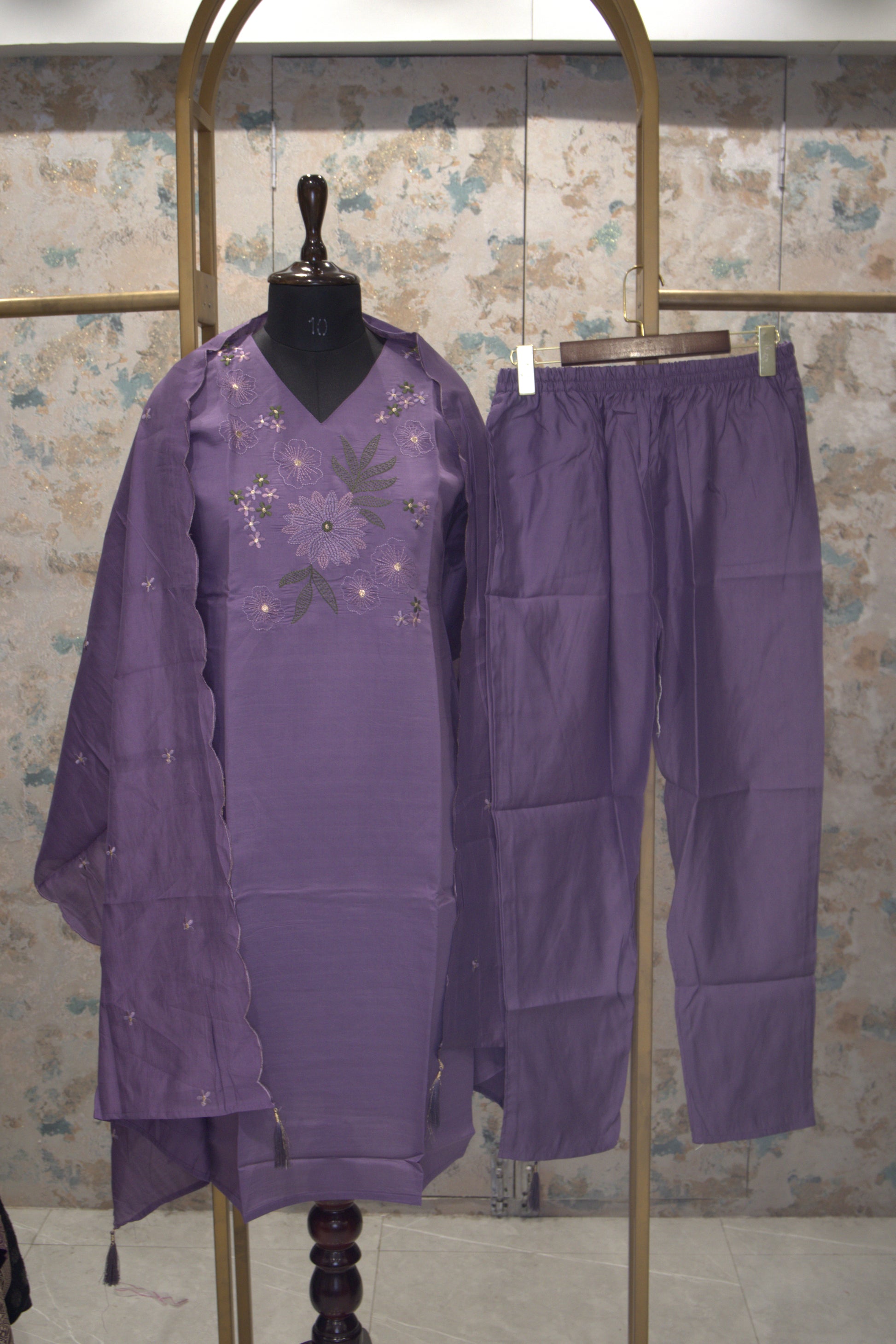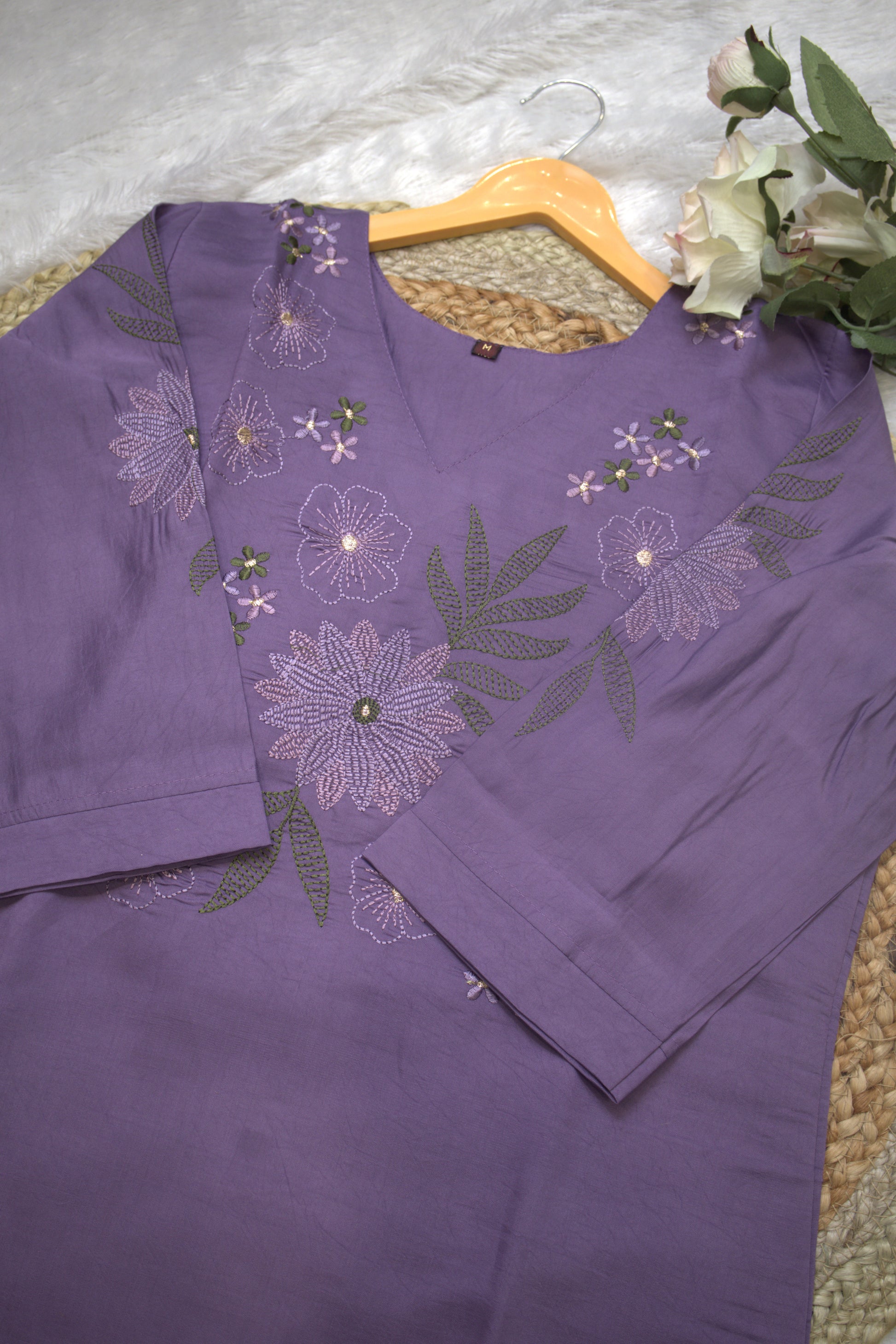 The top features a sleek a line -cut silhouette, adorned with artistic floral threadwork in soft lavender and olive tones. Every motif is delicately placed to create a refined, sophisticated look that speaks of subtle luxury.