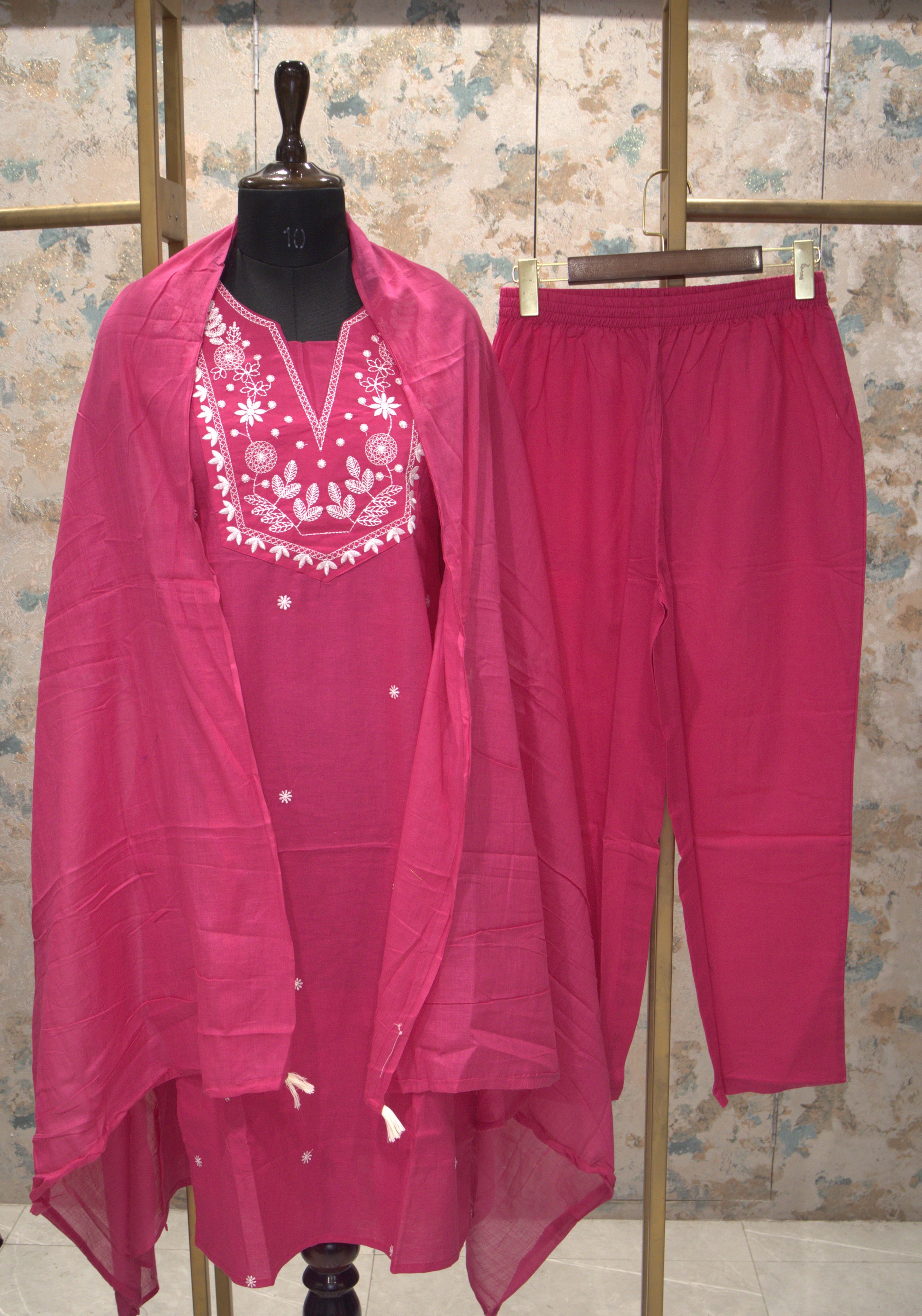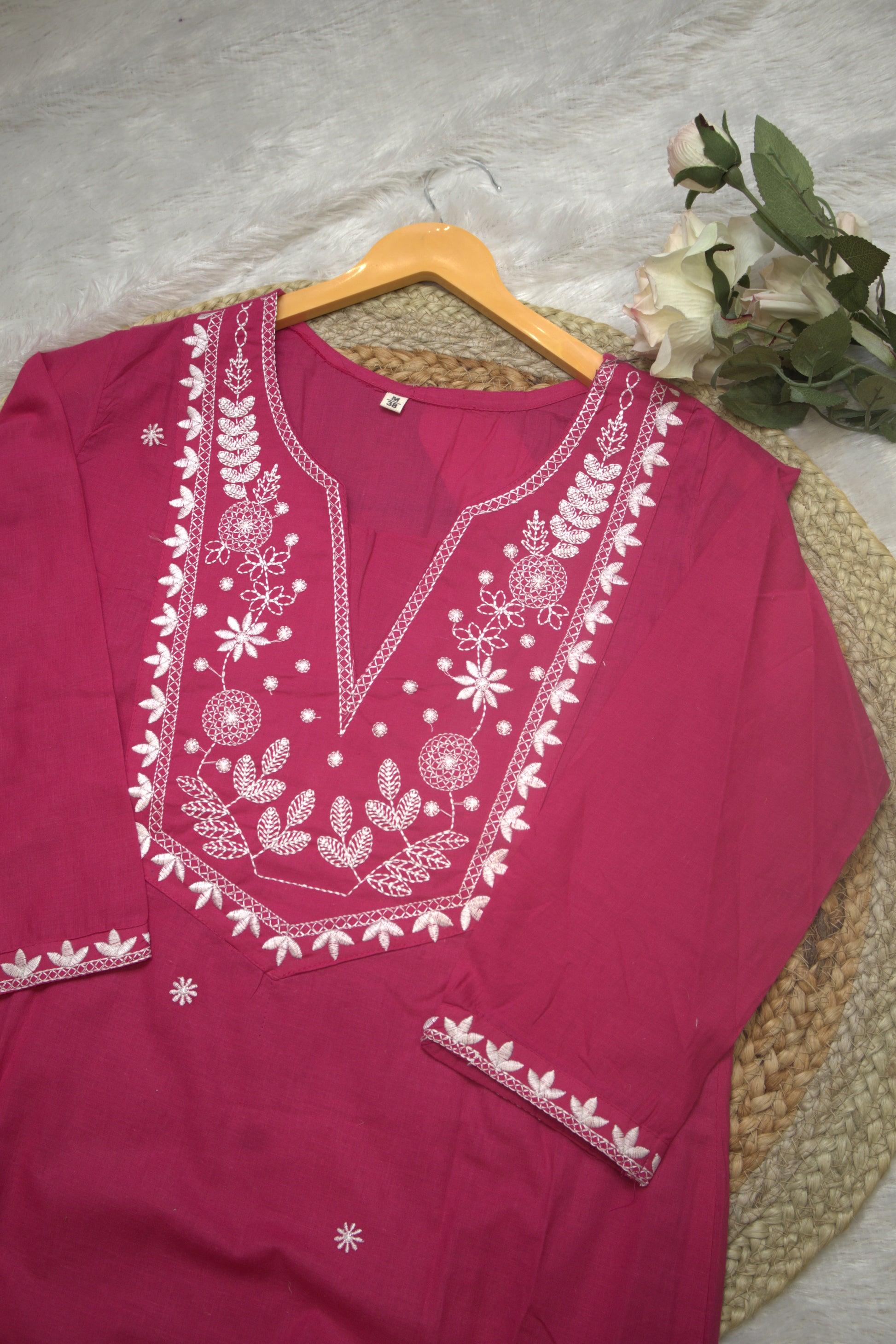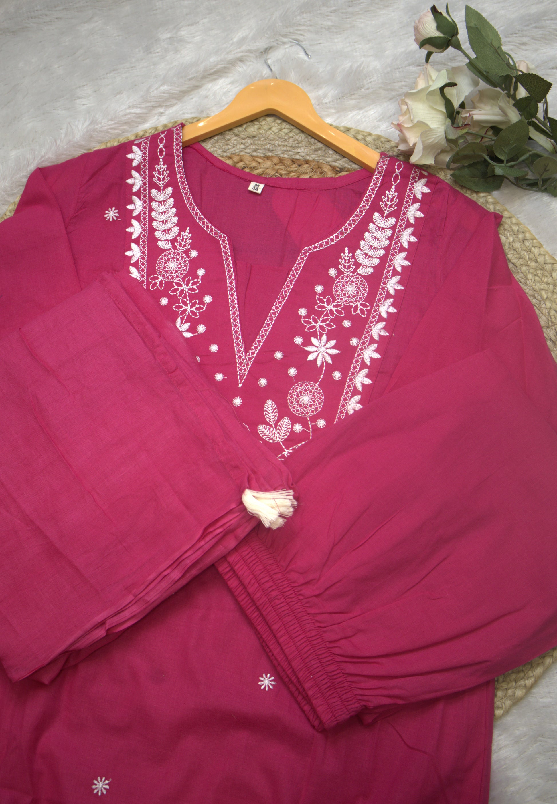 Features beautiful white thread embroidery on the front.