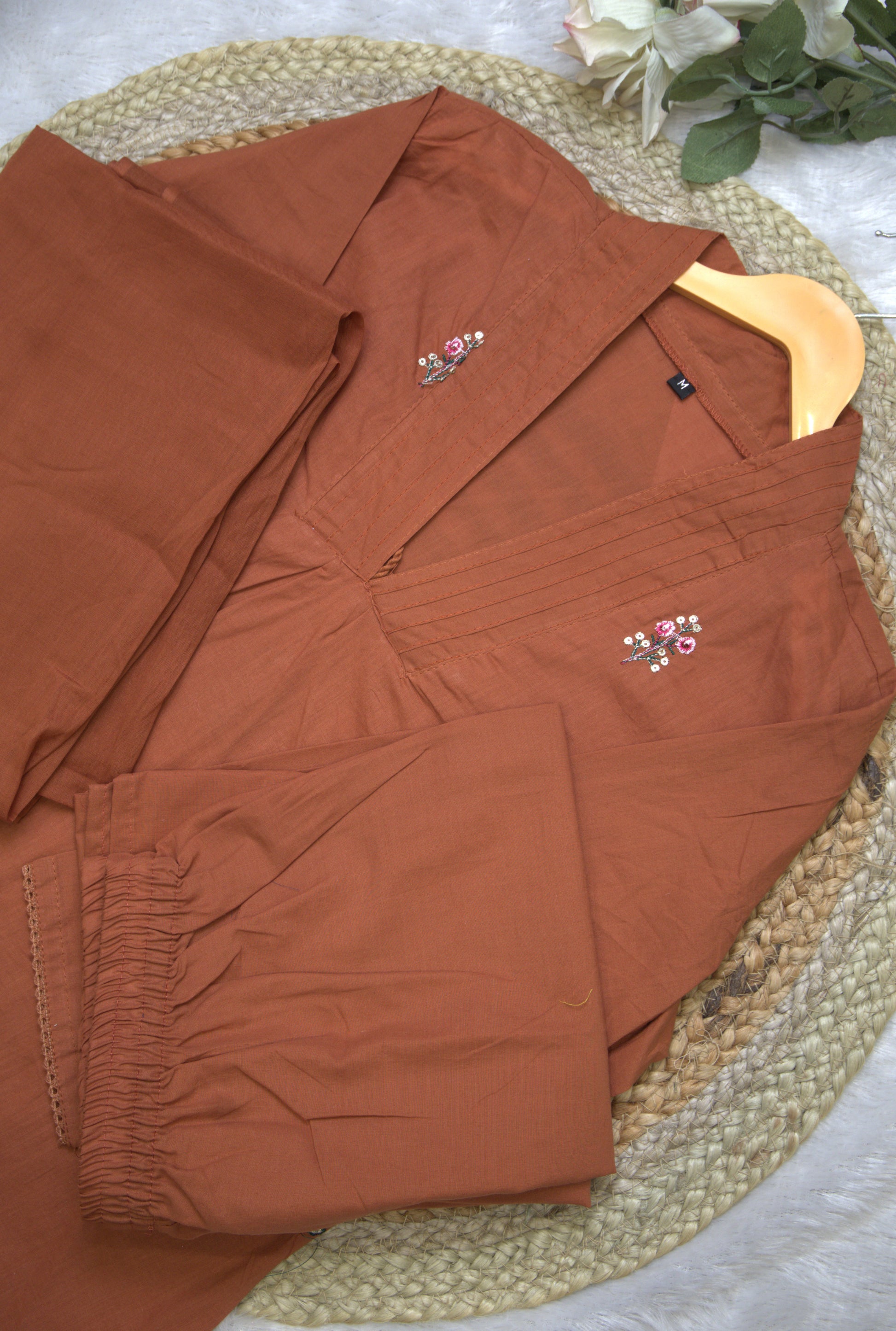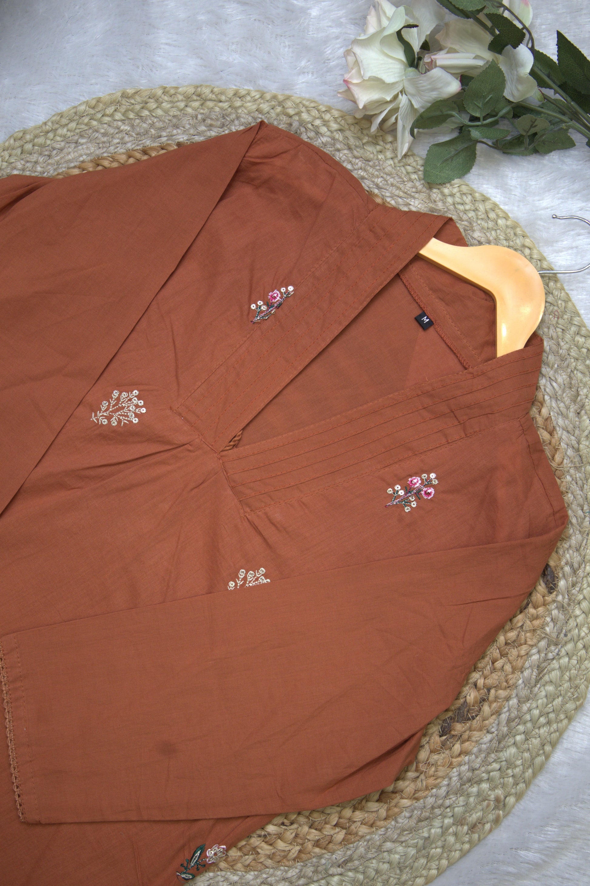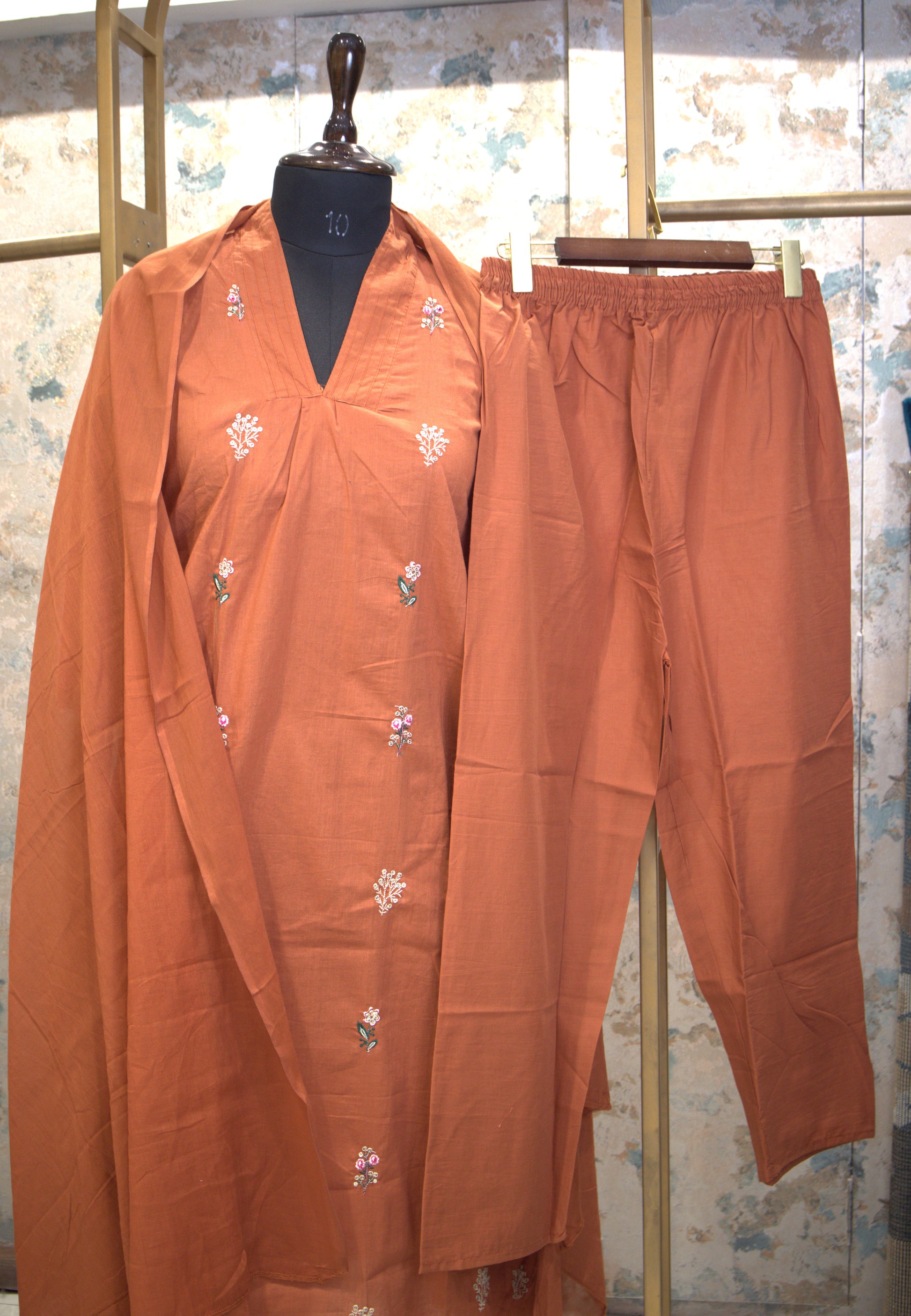 A beautifully elegant three-piece rust orange ethnic suit set featuring minimal embroidery and a modern, graceful silhouette. Perfect for office wear, daily wear, or light festive occasions.