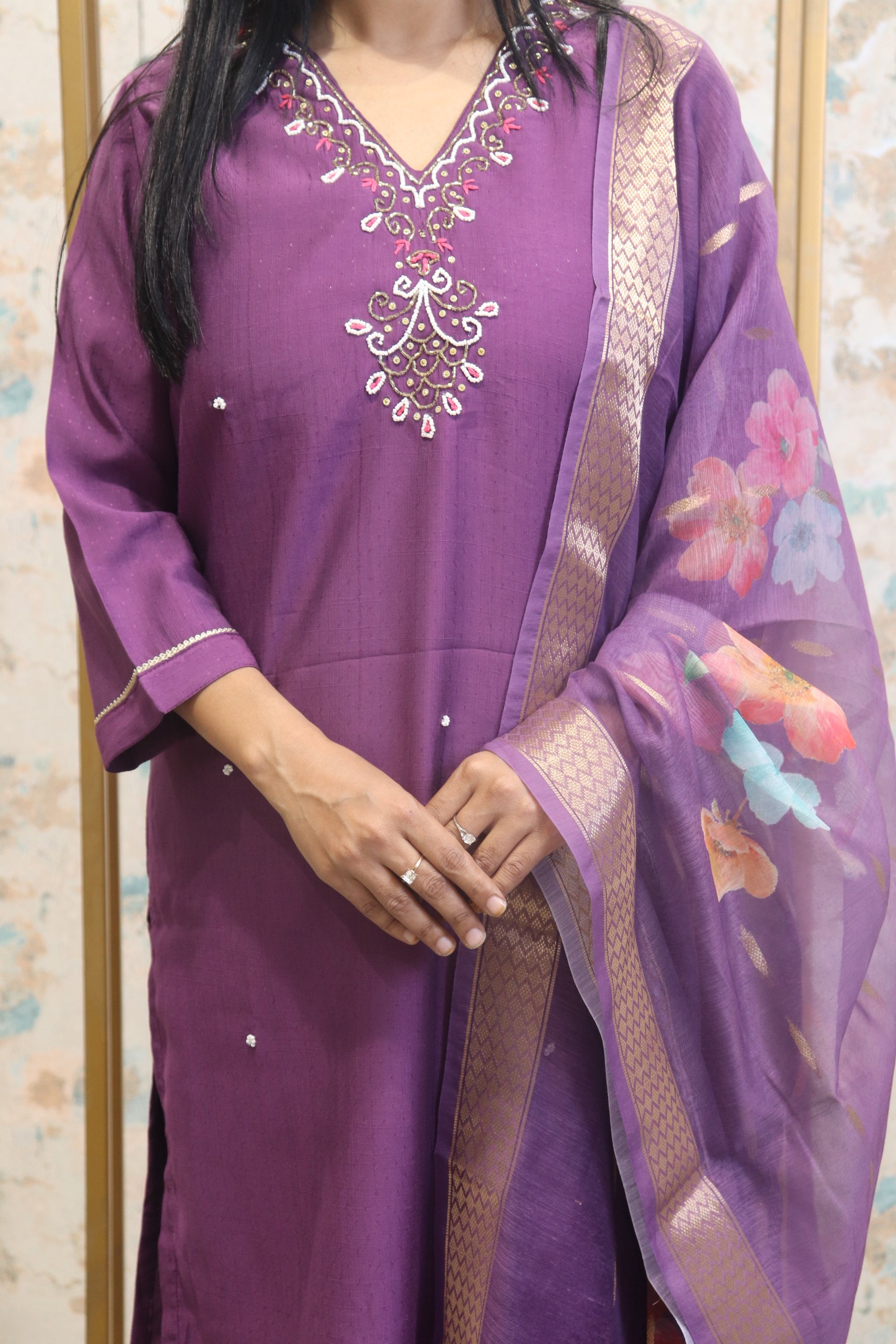Elevate your ethnic wardrobe with our silk-blend 3-piece kurta set, designed to blend elegance with comfort. The kurta features a beautifully embroidered neckline in white, pink, and golden threads, highlighted with delicate pearl-like beadwork along the cuffs and lightly scattered across the fabric for a graceful shimmer.