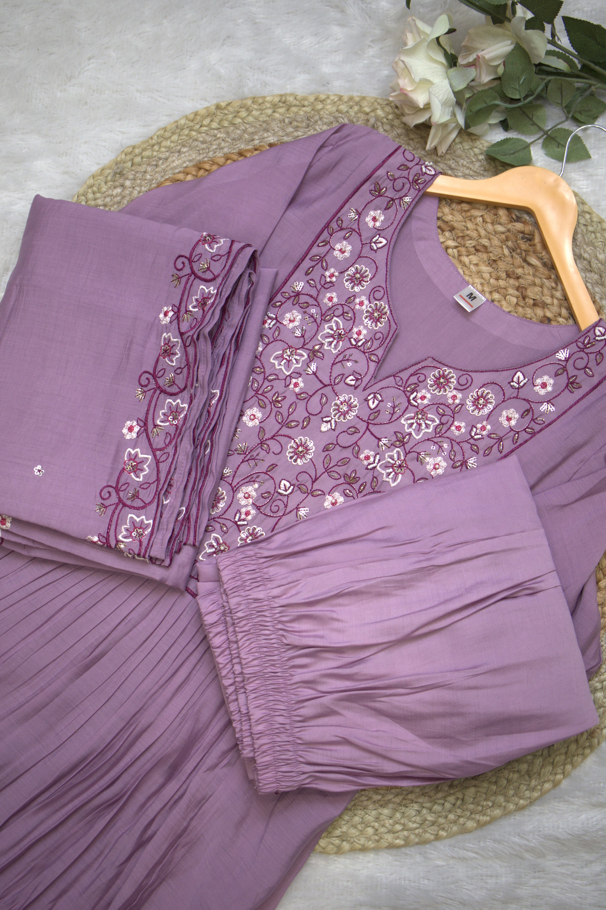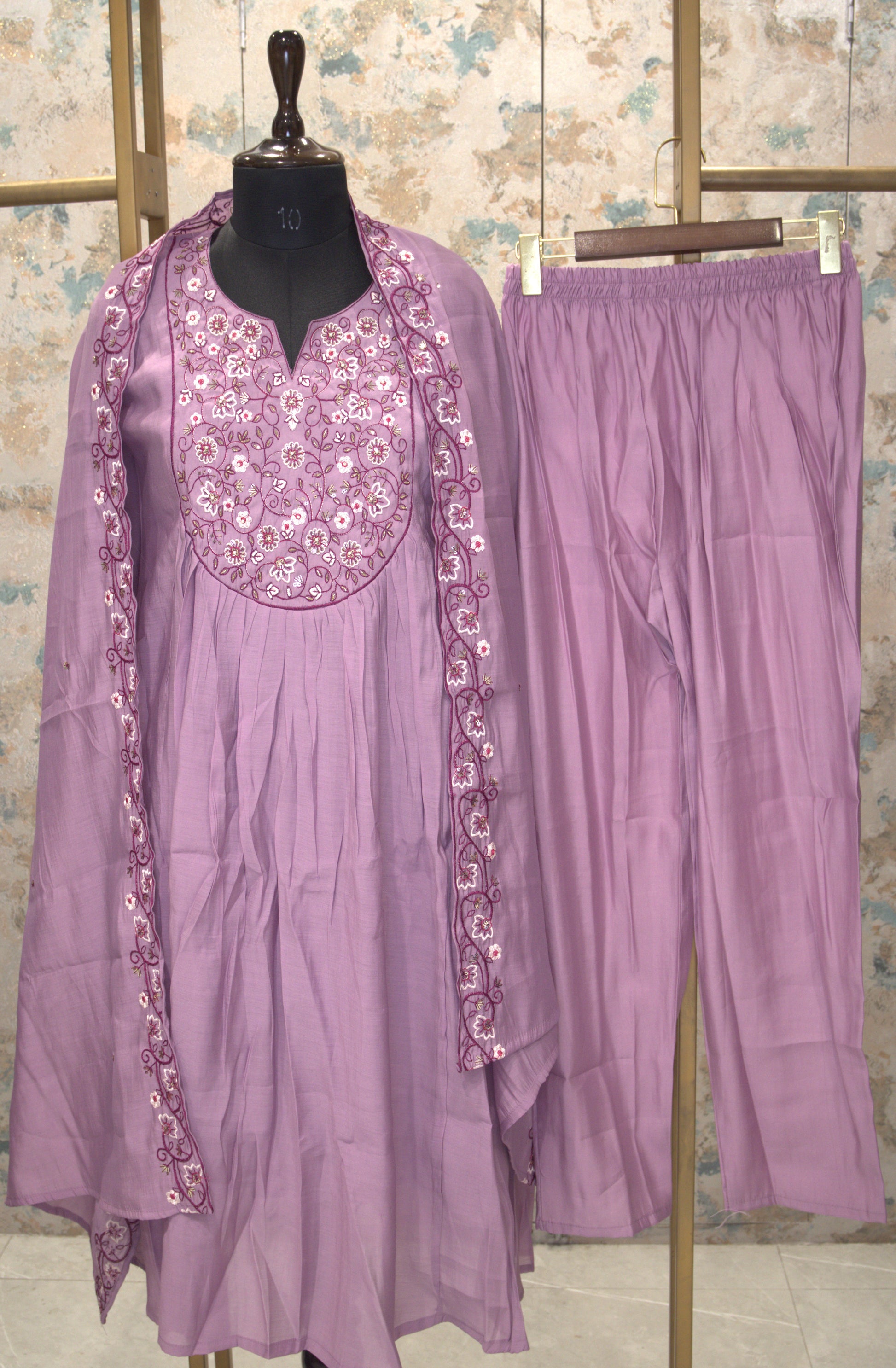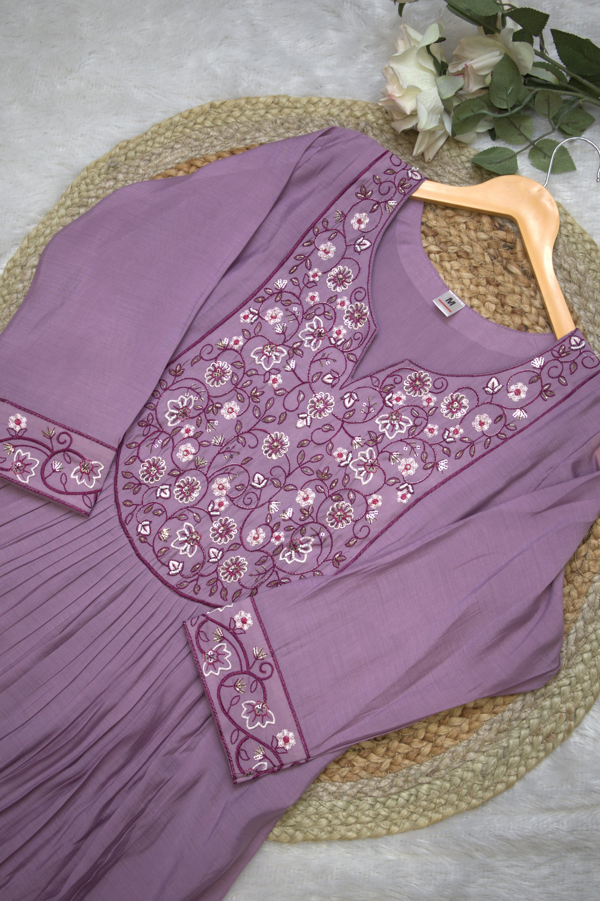 Bring freshness and soft feminine charm to your wardrobe with this Lavender Embroidered Dress. Crafted in a soothing lavender shade, this dress features a beautifully detailed rounded yoke with multicolour floral embroidery, blending shades of maroon, white, and pink to create a graceful and artistic look. The delicate threadwork adds richness, while the gentle gathers falling from the yoke give the dress a flattering, flowy, and effortlessly elegant silhouette.